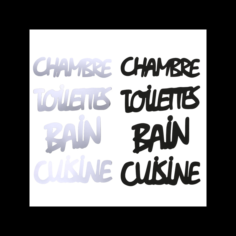 Fabriqué en acrylique durable. Des mots décoratifs originaux à mettre sur les portes de votre maison. Disponible en deux couleurs : argent et noir.